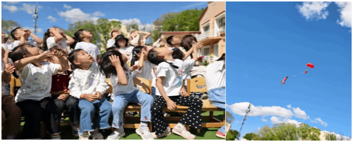 最激动人心的时刻莫过于 "水瓶火箭" 发射环节。物理科普宣讲团成员屈晟轩、仲宇铭、梁光进、赵佳鑫等人将在物理学术竞赛中精心设计制作的实验装置 ——"水瓶火箭" 搬到场地中央。只见他们熟练地将火箭安装在自制发射架上,精准地注入定量清水,然后利用打气筒逐步增加瓶内气压。当气压达到临界值时,只听 "咻" 的一声,水瓶火箭如箭矢般腾空而起,尾部喷射出细密的水雾,在天空划出一道优美的抛物线,随后缓缓降落。孩子们被这一神奇现象深深吸引,现场爆发出阵阵惊呼,有的兴奋得手舞足蹈,有的目不转睛地追踪火箭轨迹,眼中闪烁着对科学的向往之光。