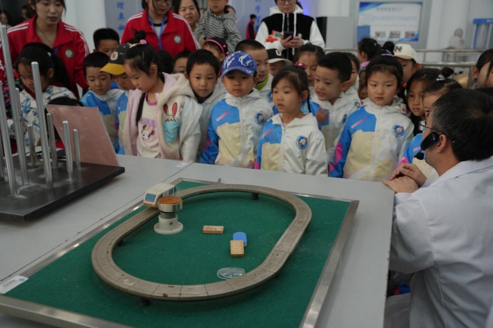 物理系教师团队匠心独运,将深奥的物理原理转化为奇幻的"魔术秀场"。超导磁悬浮列车无声滑过轨道时,此起彼伏的惊叹声如浪涌起;记忆合金在温水里舒展身姿的瞬间,稚嫩的小手不约而同指向变形轨迹。每个展台前,身着白大褂的"科学引路人"俯身与孩子们平视对话,用"为什么小火车会飞起来?"等情境化提问,将抽象的角动量守恒、电磁感应原理转化为可触摸的认知体验。
