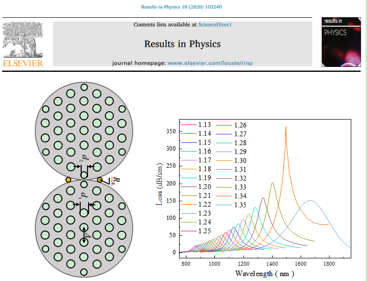 我院光纤传感技术实验室2018级硕士研究生王建伟在其导师刘超教授的指导下一直从事PCF-SPR传感器的基础理论与应用研究,近两年来在Resultsin Physics (IF=4.019)、OpticsCommunications (IF=2.215)、Optik(IF=2.187)等杂志发表SCI收录论文3篇。最近,王建伟同学设计了一种用于低折射率检测的近红外串联PCF-SPR传感器。这种串联思想利用双光纤纤芯耦合效应更易激发SPR谐振现象,极大提升了传感性能。该传感器共振波长处于865nm~1675nm近红外波段,光谱灵敏度达17500 nm/RIU,分辨率为5.71×10−6RIU。此外,该模型采用纳米线的设计代替传统镀膜方式,使得其制作工艺相对简化,为该传感器的制备和实现提供了可能。该研究成果发表于Results in Physics 18 (2020) 103240。