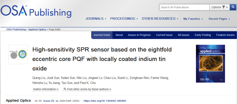 近日,我院2018级硕士生孙久帝又在《Applied Optics》(中科院JCR三区,IF=1.961)发表了一篇关于光子准晶光纤表面等离子体共振折射率传感器的科研成果(题为High-sensitivity SPR sensor based on eight-fold eccentric core PQF with locally coated indium tin oxide)。该成果设计了一种基于八重偏芯结构的光子准晶体光纤,并采用光纤表面局部涂覆等离子体材料的方法避免传感器产生高阶损耗,有效提高了折射率测量灵敏度。在折射率为1.380-1.413的检测范围内,波长灵敏度高达96667nm/RIU,折射率分辨率为1.034×10-6RIU。相关研究工作已申报发明专利。