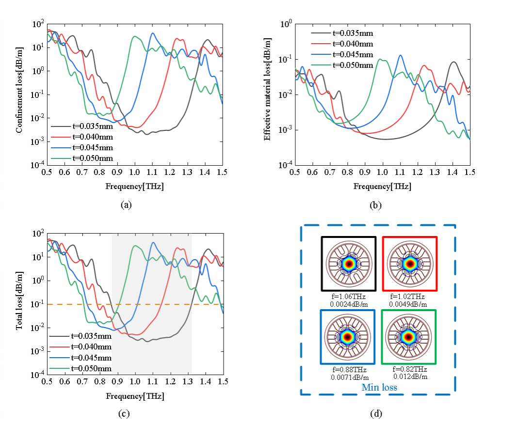 近日,我院2021级硕士生孙广荣在国际知名光学期刊《Optics and Laser Technology》(中科院2区;IF=5.0)发表了一篇题为“Anti-resonant fiber with nested U-shape tubes for low-loss terahertz waveguides”的研究论文。该成果首次采用高阻硅(HRS)作为光纤材料,设计了一种双层嵌套U型管结构反谐振光纤实现太赫兹波的低损耗传输。在1 THz时的总损耗仅为3.1 × 10-3dB/m,在0.5-1.5 THz范围内的低损耗传输带宽达到0.44 THz。此外,该反谐振光纤表现出较好的抗弯曲特性,在弯曲半径大于60 cm情况下,在1 THz时的弯曲损耗可以保持低于2.1 × 10-2dB/m。该工作首次将太赫兹波段反谐振光纤的总损耗降低至10-2dB/m以下,相关研究工作已申报国家发明专利。