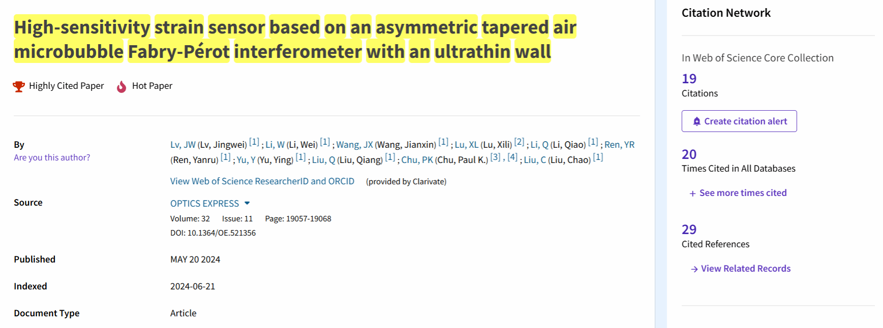 近日,我院光纤传感团队的硕士研究生李薇在光学领域国际权威期刊《Optics Express》(中科院2区TOP,影响因子3.8)上发表的论文“High-sensitivity strain sensor based on an asymmetric tapered air microbubble Fabry-Pérot interferometer with an ultrathin wall ”被全球学术引文索引数据库“Web of Science”遴选为“高被引论文”和“热点论文”,并于2025年1月21日进行报道。
