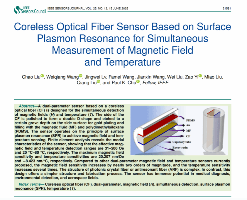 论文信息: Coreless optical fiber sensor based on surface plasmon resonance for simultaneous measurement of magnetic field and temperature. IEEE Sensors Journal,2025,25(12):21581-21588