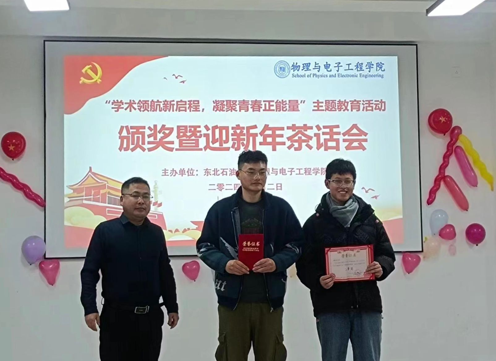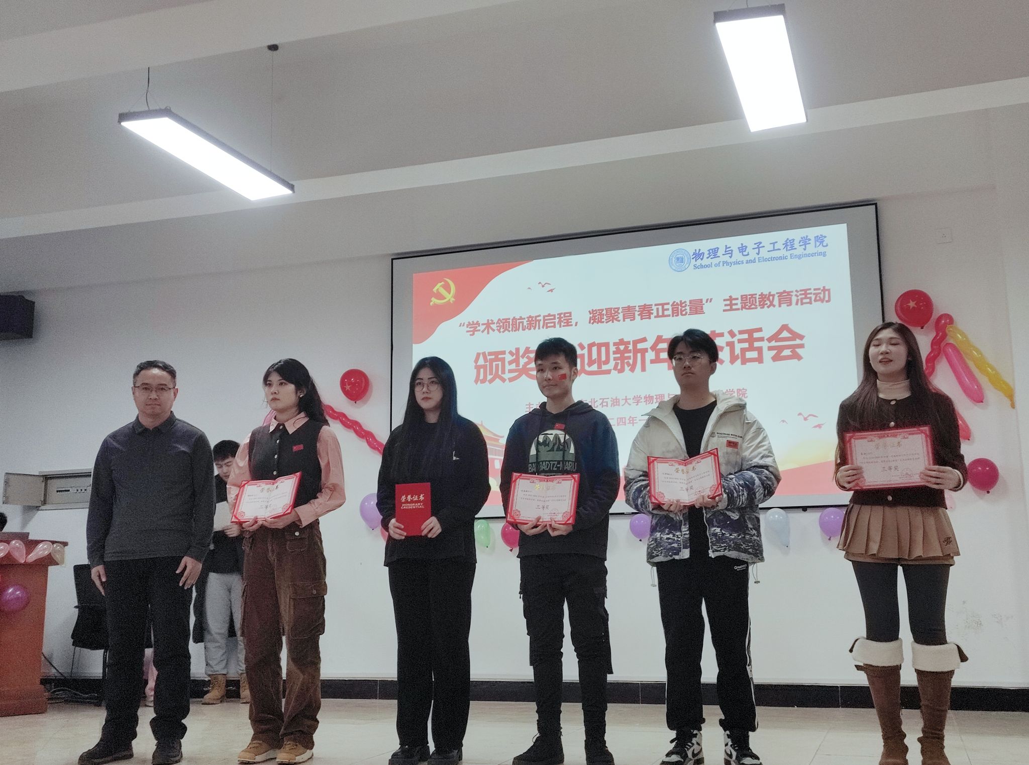 最后,我院于2024年1月2日开展了“学术领航新启程,凝聚青春正能量”主题教育活动颁奖暨迎新年茶话会,参会领导有:党委书记刘超、院长韩建、党委副书记王东明、副院长罗伟、副院长刘强。根据积分排序,本次主题教育活动共设奖励三个等级,在颁奖会上,我院领导为获奖同学代表颁发了荣誉证书,极大地鼓励了研究生的活动热情。在迎新年茶话会上,同学们通过歌唱、舞蹈、游戏等丰富多彩的表演形式给大家带来了一场视听盛宴,整场演出气氛热烈,掌声不断,为庆祝新年的到来增添了浓厚的氛围。