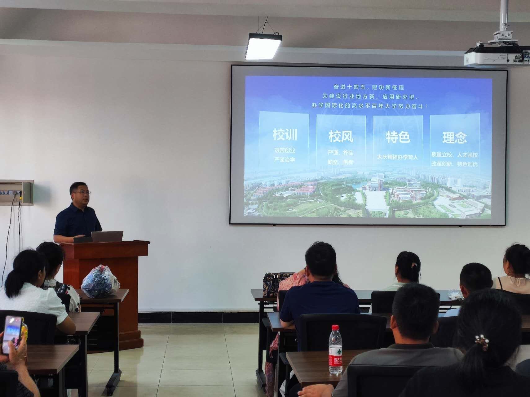 随后,院长韩建同志讲解了学校历史、所获荣誉、校训校风和办学理念。并着重对家长们关心的学院情况、各专业的建设发展情况、伟德国际、比赛项目、日常活动、社会实践及就业情况进行了详细的介绍。