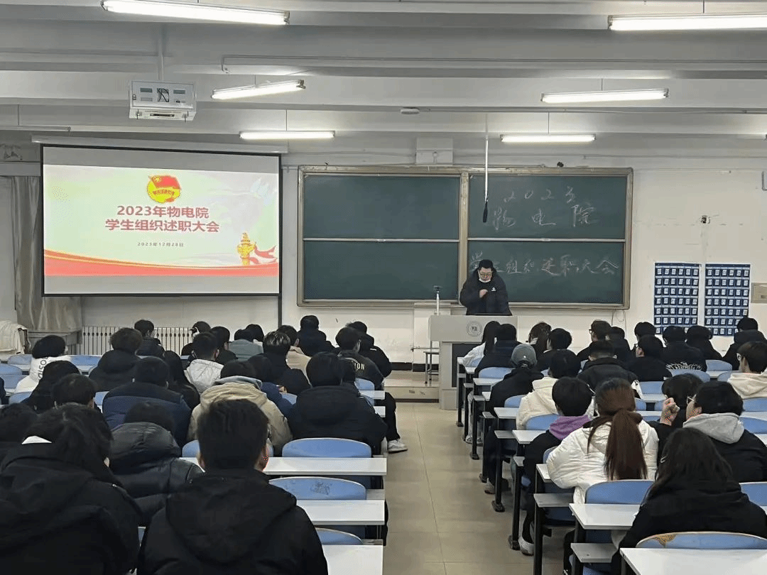 为进一步加强学院学生组织建设,提升学生干部工作能力。2023年12月28日召开“2023物电院学生组织述职大会”。此次会议由庄翔博老师主持,辅导员老师:王丽莉、刘小嘉、宫新婷、马严、张雪莹参加。院党委副书记王东明到会并进行讲话。