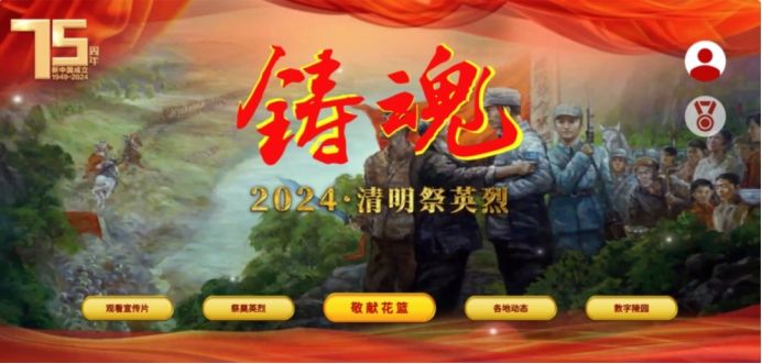 进入活动界面后有五个子版块,分别是“观看宣传片”“祭奠英烈”“敬献花篮”“各地动态”“数字陵园”。